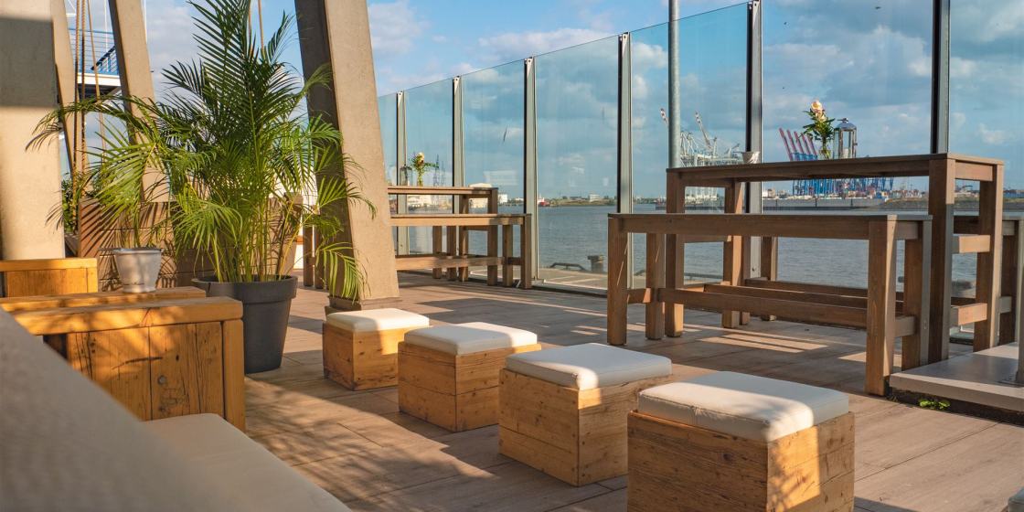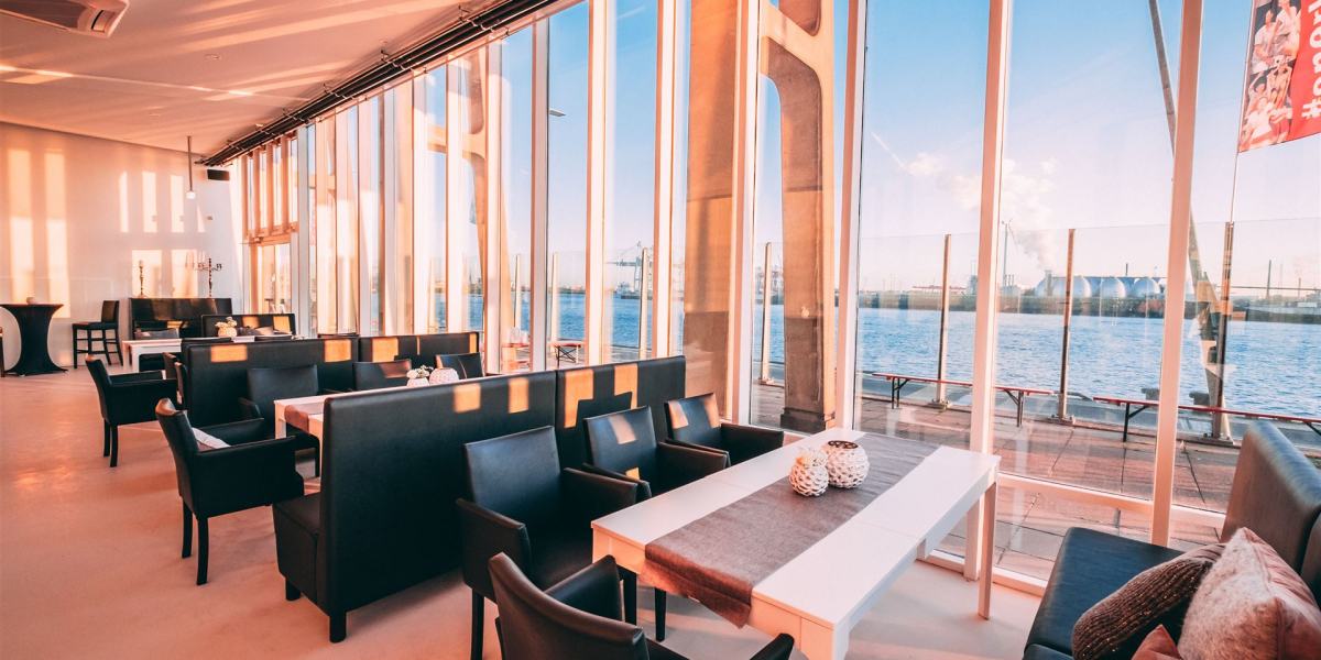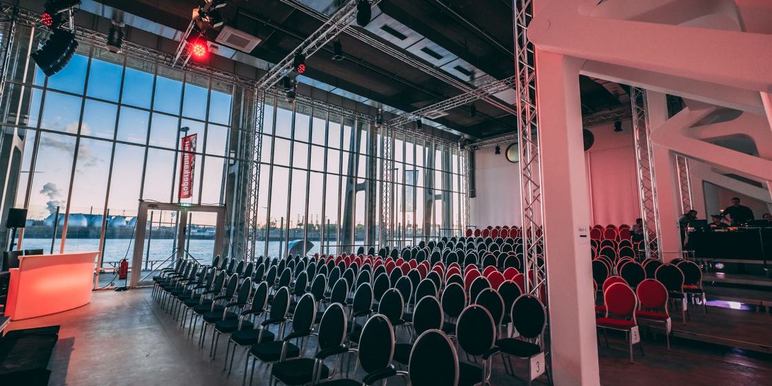 Auf 700 m² Innenfläche und einer 250 m² großen Elbterrasse finden bis zu 400 Gäste Platz. Der lichtdurchflutete Saal mit seinen beeindruckenden Panoramafenstern bietet einen atemberaubenden Blick auf den Hamburger Hafen – ein visuelles Highlight, das Ihre Veranstaltung unvergesslich macht.