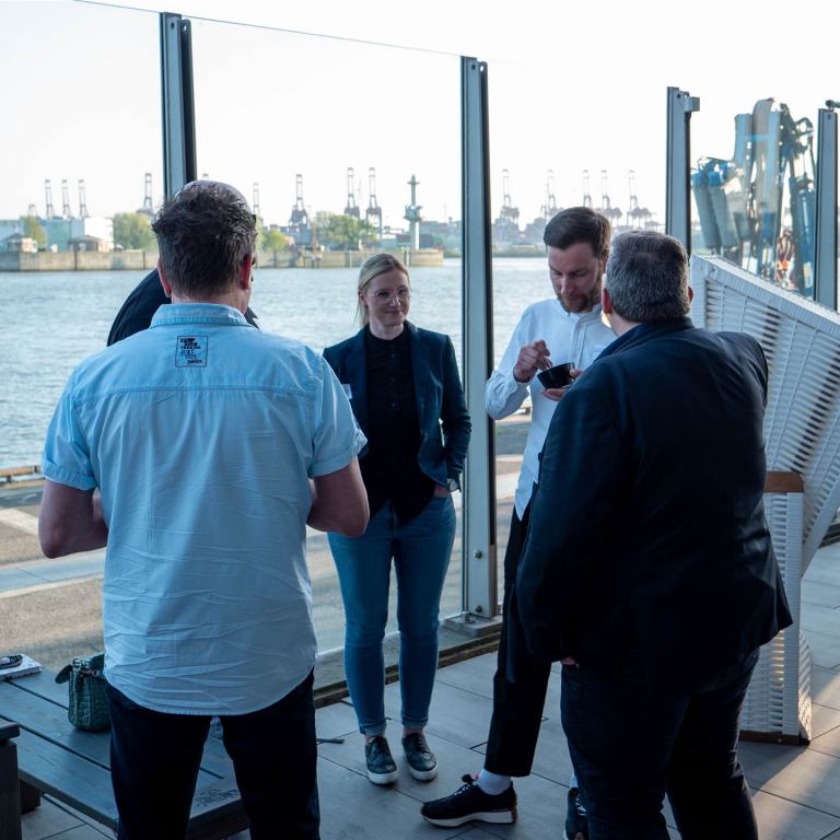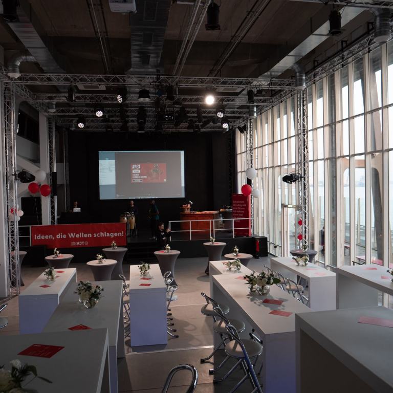 Wir bieten Ihnen eine Location mit großzügigen Panoramafenstern mit einem kompletten Blick über den Hamburger Hafen. Unsere Location eignet sich für Produktpräsentationen, Unternehmensvorstellungen, zu Messezwecken oder für ein Jubiläum.
