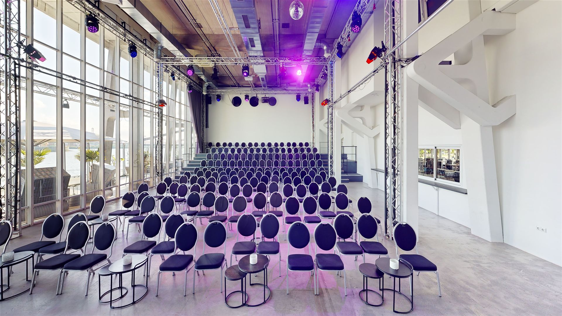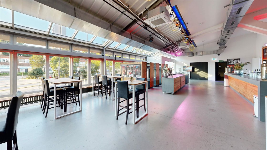 Auf insgesamt 700 qm Innenfläche und 250 qm großer Außenfläche finden bis zu 400 Personen Platz. Der Saal überzeugt mit einer hervorragenden Akustik und ist mit professioneller Ton- und Lichttechnik sowie einer großen Theaterbühne ausgestattet. An der großen Foyerbar stehen zahlreiche Kühlmöglichkeiten sowie eine Zapfanlage zur Verfügung. Das Bistro wird durch eine Gastronomieküche sowie angrenzende Vorbereitungs- und Lagerräume ergänzt. Alle Räumlichkeiten sind mit Licht- und Tontechnik ausgestattet.
