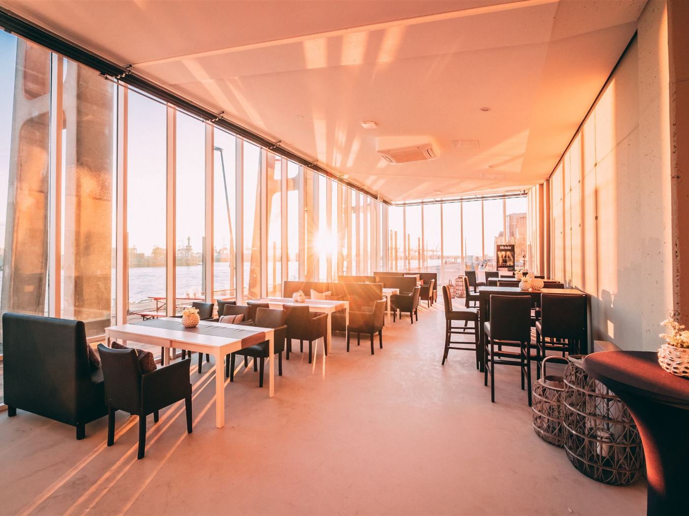 Der 120 m² große Bistrobereich eignet sich ideal für kleinere Gruppen (bis zu 60 Personen) sowie als Ergänzungsfläche für Catering oder parallel laufende Programmpunkte. Auch aus dem Bistro hat man einen spektakulären Blick auf Hafen und Elbe. Durch den direkten Zugang zur Elbterrasse lässt sich eine Nutzung mit der Außenfläche ideal verbinden.